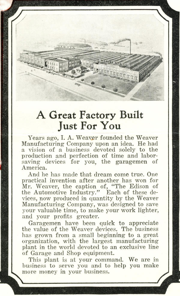The 1927 Garage Equipment Brochure details how Weaver grew from a one product (The Auto Twin Jack) factory of only 1680 square footage to a 130,000 square foot factory producing over 50 products - The largest Plant of it's kind in the world devoted exclusively to Automotive Garage and Shop Equipment Products. |