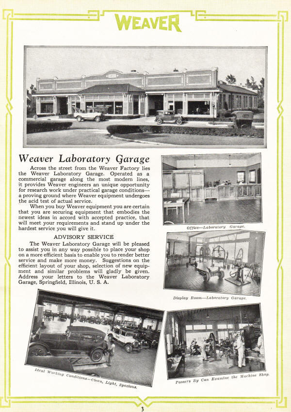 The Weaver Laboratory Garage is highlighted in this 1927 brochure. Located across the street from the Weaver Plant -- Here test engineers developed and improved the Weaver Line. |